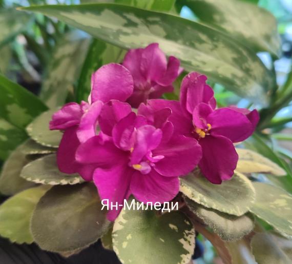 Крупные полумахровые-махровые красно-фиолетовые цветы с разрезанными до конца складчатыми цветами. Листья слегка стеганые зеленые с белой пестролистностью. Стандарт